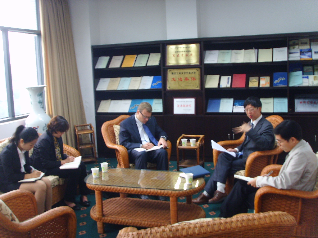 2012年10月19日上午,美国驻成都领事馆副领事安瑞先生莅临我校长江上游经济研究中心,与我校副校长黄志亮教授、国际合作与交流处韩艳处长、许老师、重庆市社科院彭国川博士、中心副主任杨文举教授等就重庆宏观经济进行交流。