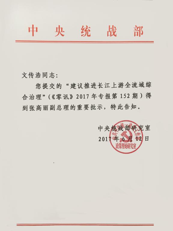 近日,由我校长江上游经济研究中心文传浩教授组织和带领长江上游(流域)复合生态系统管理研究创新团队撰写的《建议推进长江上游全流域综合治理》一文,被中央统战部党外人士建言《零讯》刊物(此刊物专供中央领导参阅)采用,并得到张高丽副总理重要批示。