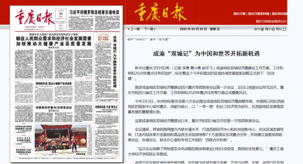 成渝地区双城经济圈建设工作方案、工作机制和2020年重点任务的出炉,标志着这个今年初提出的区域协调发展国家战略正式按下“启动键”。