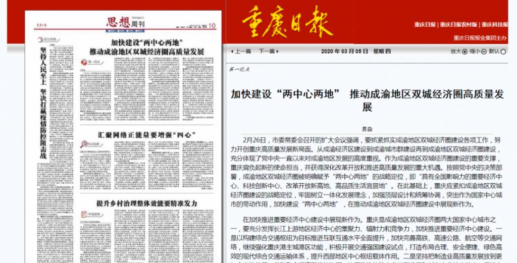 2020年2月26日,市委常委会召开的扩大会议强调,要抓紧抓实成渝地区双城经济圈建设各项工作,努力开创重庆高质量发展新局面。从成渝经济区建设到成渝城市群建设再到成渝地区双城经济圈建设,充分体现了党中央一直以来对成渝地区发展的高度重视。作为成渝地区双城经济圈建设的重要支撑,重庆肩负起新的使命担当,并获得深化改革开放和推进高质量发展的重大机遇。按照党中央的决策部署,成渝地区双城经济圈被明确赋予“两中心两地”的战略定位,即“具有全国影响力的重要经济中心、科技创新中心、改革开放新高地、高品质生活宜居地”。在此基础上,重庆应紧扣成渝地区双城经济圈建设的战略定位,牢固树立一体化发展理念,加强顶层设计和统筹协调,突出作为国家中心城市的带动作用,加快建设“两中心两地”,在推动成渝地区双城经济圈建设中展现新作为。