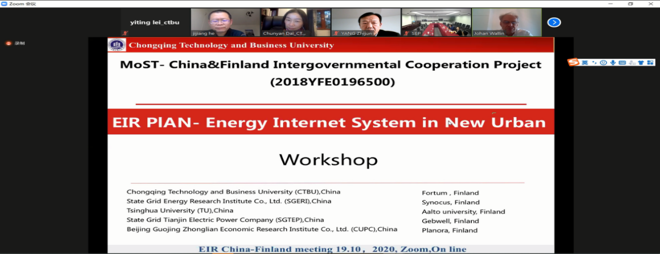 为了推进项目进展,促进中芬科学研究与合作交流,厘清共同研究与合作的关键点,2020年10月19日北京时间18:00-22:00,国家重点研发计划政府间合作重点专项“EIR计划—新型城镇能源互联系统研究及试点应用” (编号:SQ2018YFE0196500)项目组,通过线上+线下的方式,成功召开中芬合作试点项目推进会。本次研讨会由项目牵头单位重庆工商大学主办,由重庆工商大学长江上游经济研究中心长江经济带绿色低碳可持续发展研究团队负责人代春艳教授与芬兰Synocus的约翰博士联合主持会议,来自清华大学、国网能源yl23411永利(集团)有限公司官网、国网天津电力、北京国经中联经济研究所、中国驻芬兰大使馆、国家发改委能源研究所、合肥市发改委能源办、合肥热力、上海电力、启迪清洁能源yl23411永利(集团)有限公司官网、上海华电、Fortum、Gebwell、Planora、Synocus等近二十家中国与芬兰的高校、研究机构、企业及政府机构的学者、企业家、官员和学生参与了本次会议。