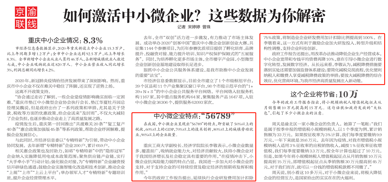 市经济信息委数据显示,2020年重庆新设立中小企业15.3万户,比上年同期多增1.2万户;全市中小企业达到92.5万户,比上年增长8.3%。全市新增中小企业从业人员约46万人,占新增城镇就业人数近七成,中小企业吸纳就业近820万人。中小企业营业收入同比增长3%,利润总额同比增长4.2%。在我国,中小微企业呈现出“56789”的特点,即贡献了50%以上的税收,60%以上的GDP,70%以上的技术创新,80%以上的城镇劳动就业,90%以上的企业数量。