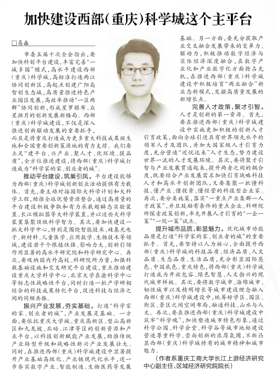 市委五届十次全会指出,要加快科创平台建设,丰富完善“一城多园”模式,高水平建设西部(重庆)科学城,高标准打造两江协同创新区,高起点创建广阳岛智创生态城,高质量推进特色产业园区发展,高效率推动“一区两群”协同创新,形成星罗棋布、众星拱月的创新发展新格局。西部(重庆)科学城建设,不仅是深入推进创新驱动发展的重要抓手,而且是将重庆打造成为更多重大科技成果诞生地和全国重要创新策源地的有力支撑。我们要立足“建平台、兴产业、聚人才、优环境、提品质”,全方位推进建设,将西部(重庆)科学城打造成为“科学家的家、创业者的城”。
