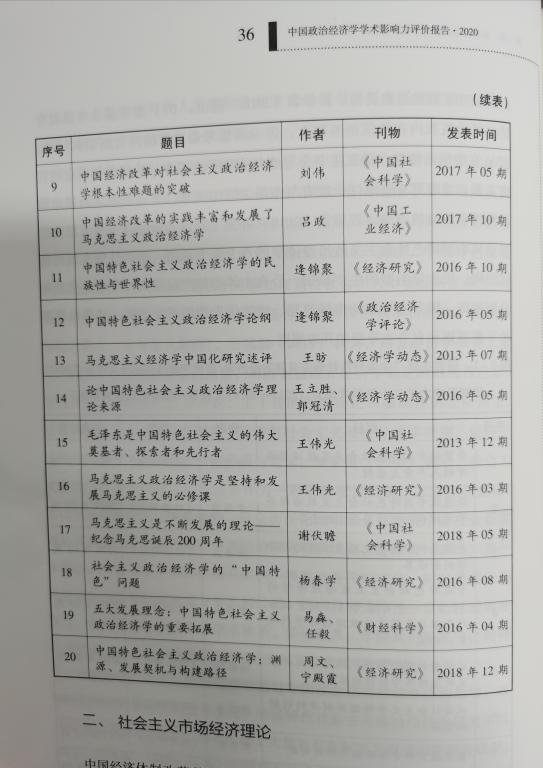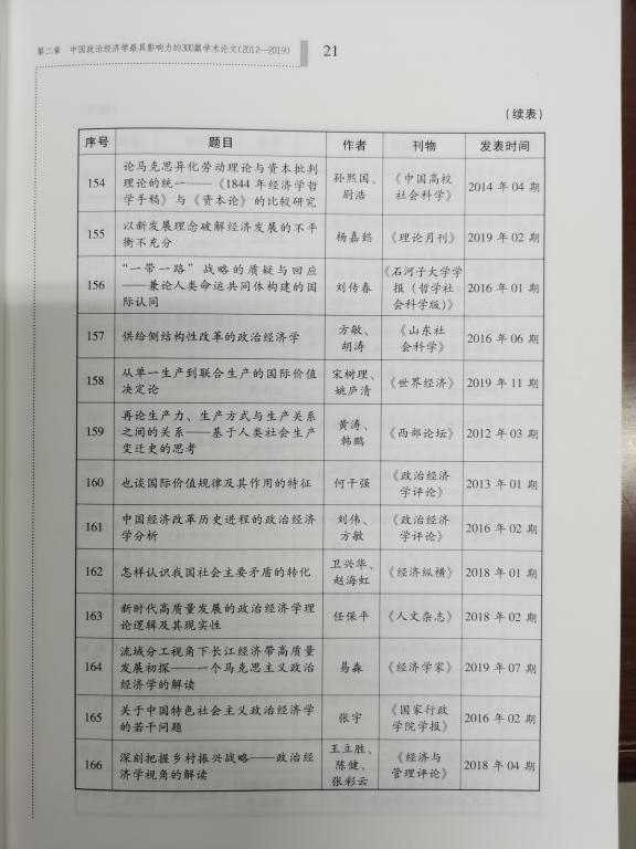 同时,易淼教授、任毅教授的《五大发展理念:中国特色社会主义政治经济学的重要拓展》一文还收录在“中国特色社会主义政治经济学”最具影响力的20篇学术论文(2012-2019)名单中;易淼教授的《流域分工视角下长江经济带高质量发展初探》一文还收录在“政治经济学视野下的经济增长与高质量发展研究”最具影响力的20篇学术论文(2012-2019)名单中。
