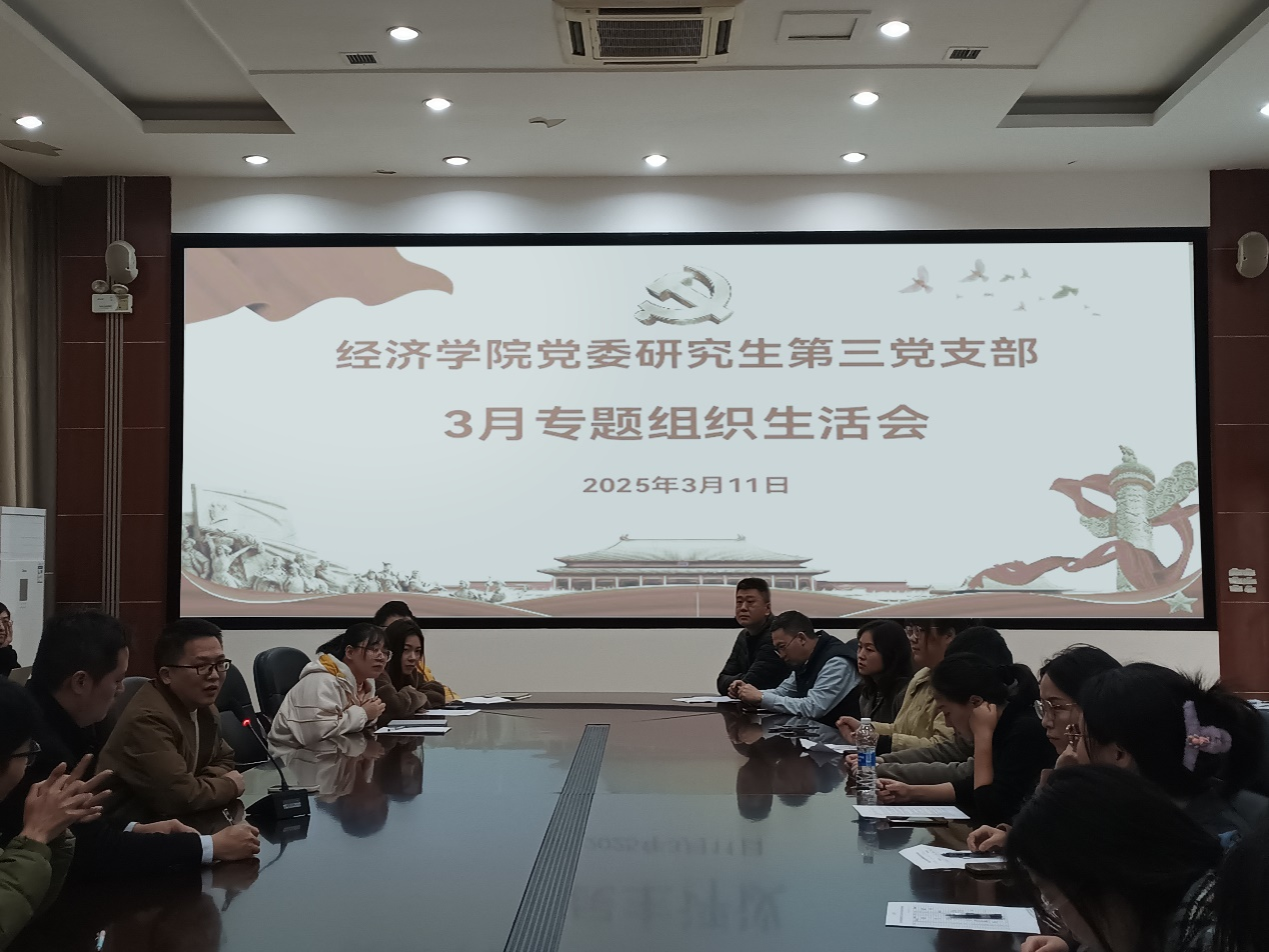 2025年3月11日,经济学院党委研究生第三党支部在田家炳书院6楼会议室开展专题组织生活会,经济学院党委委员、成渝地区双城经济圈建设yl23411永利(集团)有限公司官网副院长黄潇到会指导并发言,会议由支部书记刘晗主持。