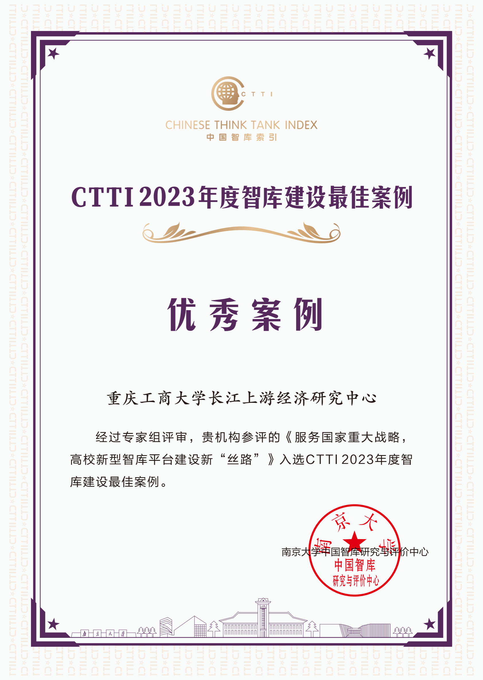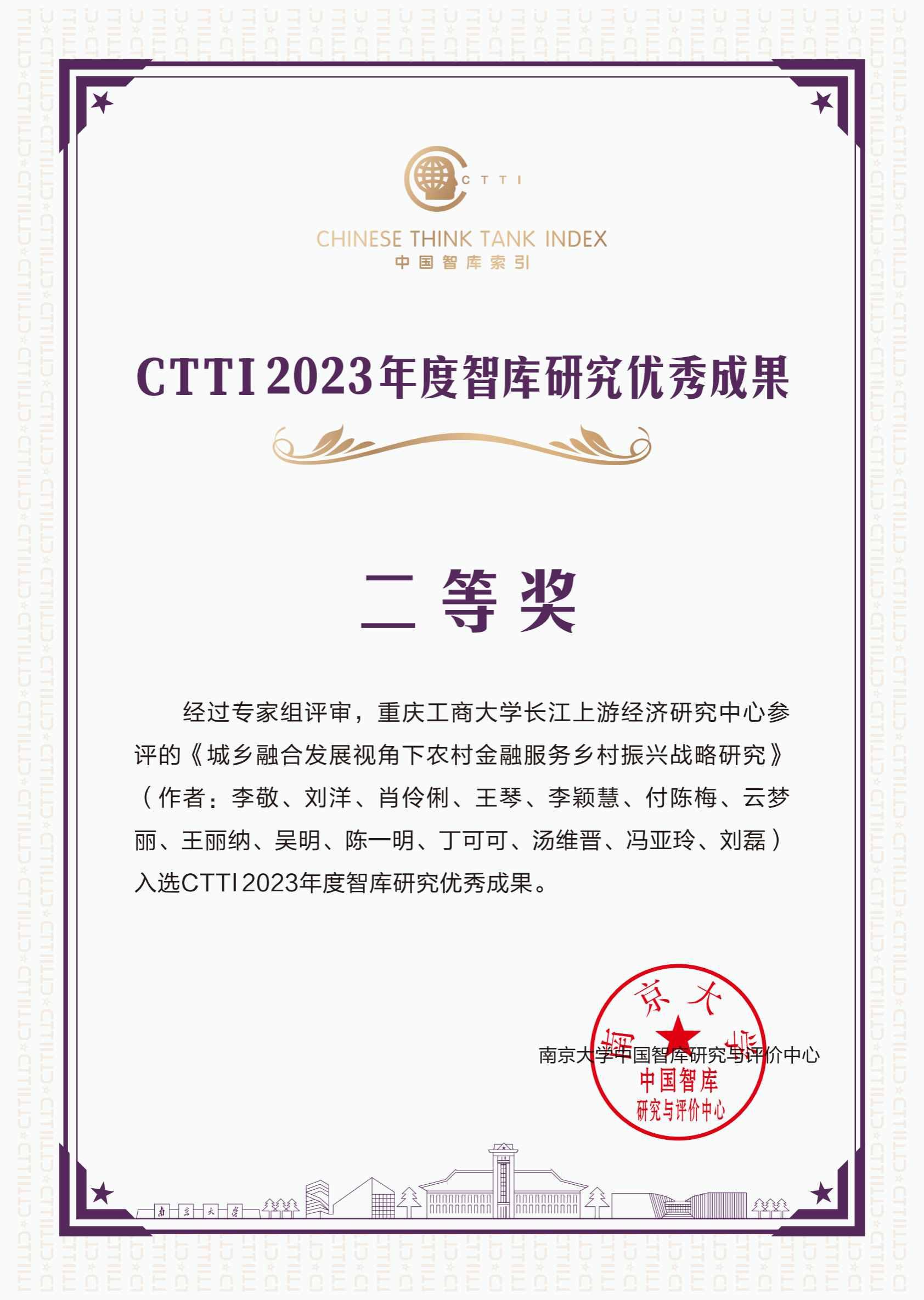 论坛公布了CTTI 2023年度智库最佳案例与优秀成果征集与推介活动的结果,中心总结智库建设经验方法形成的案例《服务国家重大战略,高校新型智库平台建设新“丝路”》入选CTTI2023年度智库建设优秀案例,中心常务副主任李敬教授领衔完成的智库成果《城乡融合发展视角下农村金融服务乡村振兴战略研究》获得CTTI2023年度智库优秀成果二等奖。