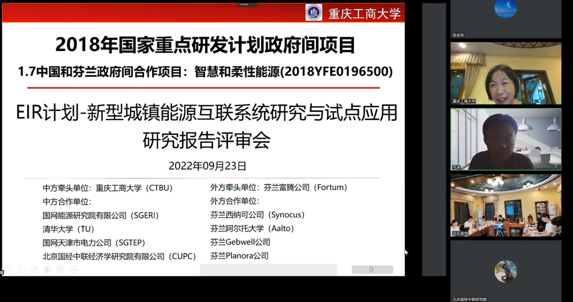 2022年9月23日,长江上游经济研究中心特聘研究员代春艳教授主持的国家重点研发计划政府间科技创新合作重点专项“EIR计划-新型城镇能源互联系统研究与试点应用”(项目编号:2018YFE0196500)项目的研究报告专家评审会以线上线下相结合的会议方式,在重庆工商大学南山书院顺利召开。
