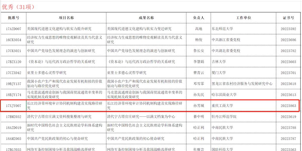 12月1日,全国哲学社会科学工作办公室公布了2022年11月国家社科基金年度项目、青年项目和西部项目结项情况。我校校长、长江上游经济研究中心主任孙芳城教授主持的“长江经济带环境审计协同机制构建及实现路径研究”(项目号17XJY007;结题证书号20223863),获得“优秀”等级。