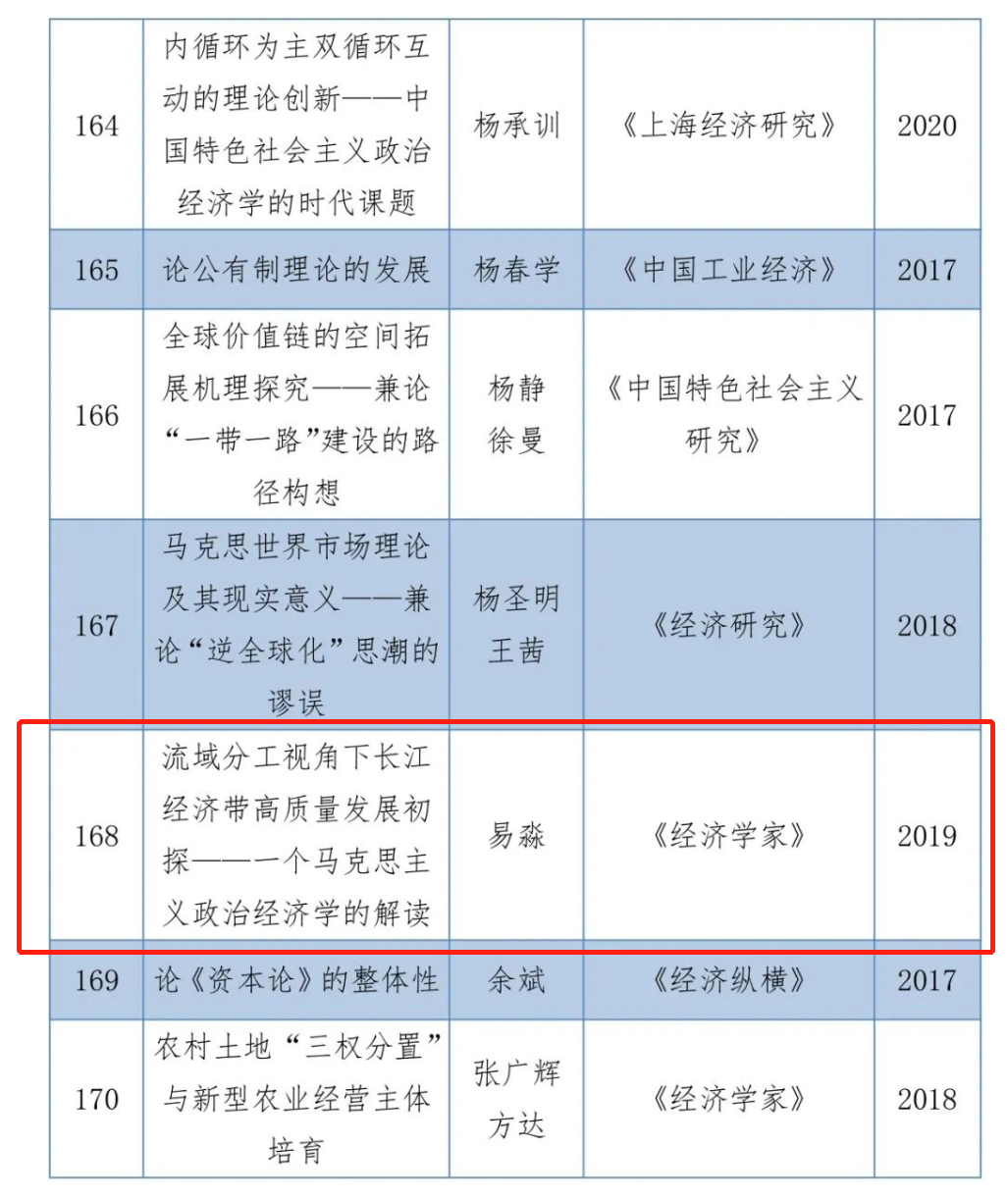 近日,由王立胜、程恩富任主编的《中国政治经济学学术影响力评价报告(2022)》发布。中心副主任易淼教授发表于《经济学家》2019年第7期的论文《流域分工视角下长江经济带高质量发展初探——一个马克思主义政治经济学的解读》入选“中国政治经济学最具影响力的200篇学术论文(2017-2021)”。