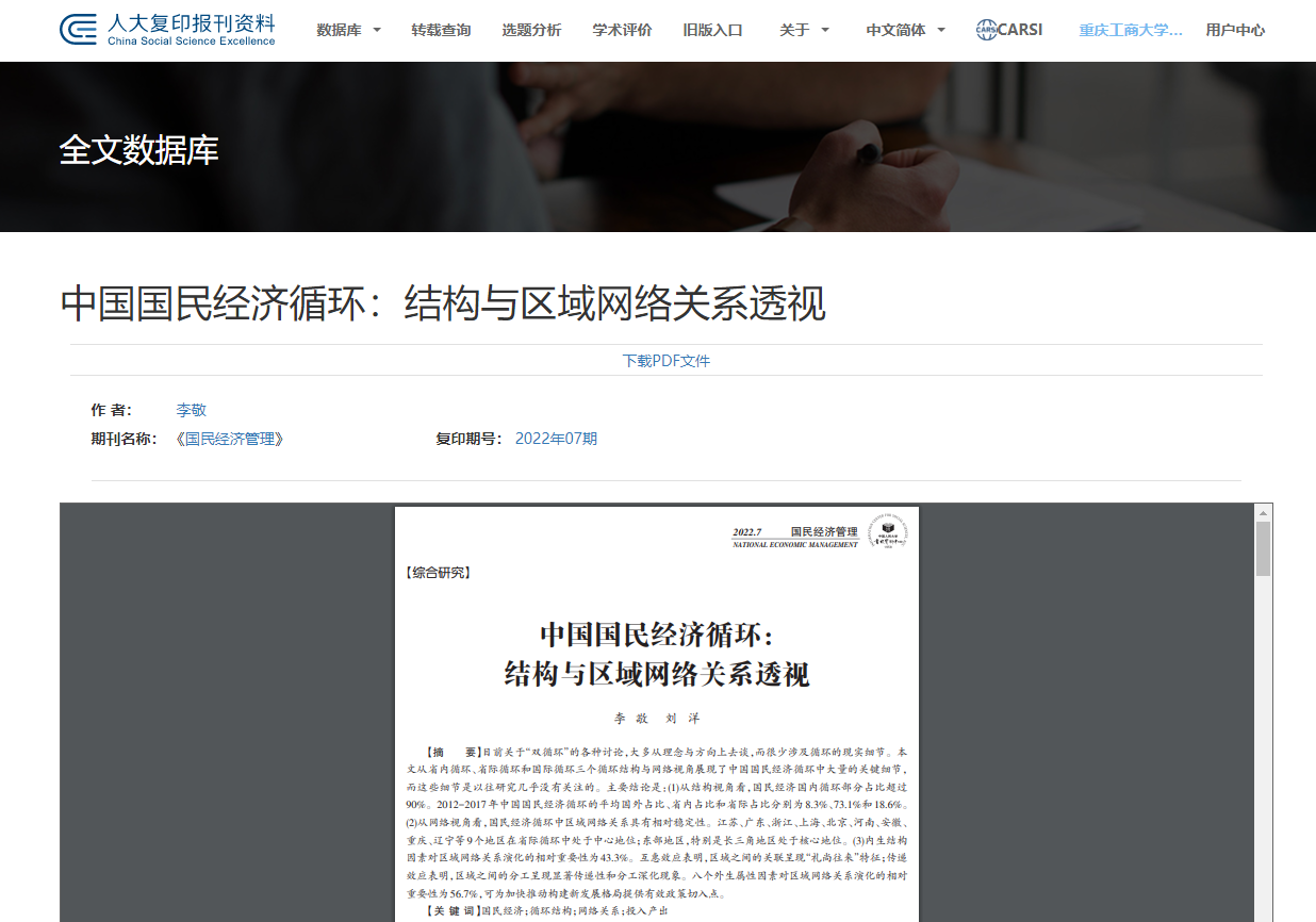 重庆工商大学副校长、长江上游经济研究中心常务副主任李敬教授发表在经济学权威期刊《经济研究》2022年第2期上的学术论文《中国国民经济循环:结构与区域网络关系透视》被人大复印资料《国民经济管理》2022年第07期全文转载。