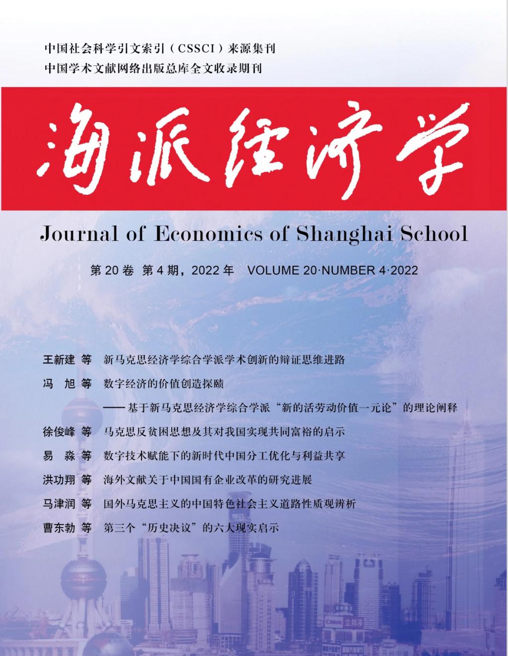 2022年12月31日,中心副主任易淼教授等围绕党的二十大精神学习,在CSSCI集刊《海派经济学》(季刊)发表论文《数字技术赋能下的新时代中国分工优化与利益共享》并列为封面文章。