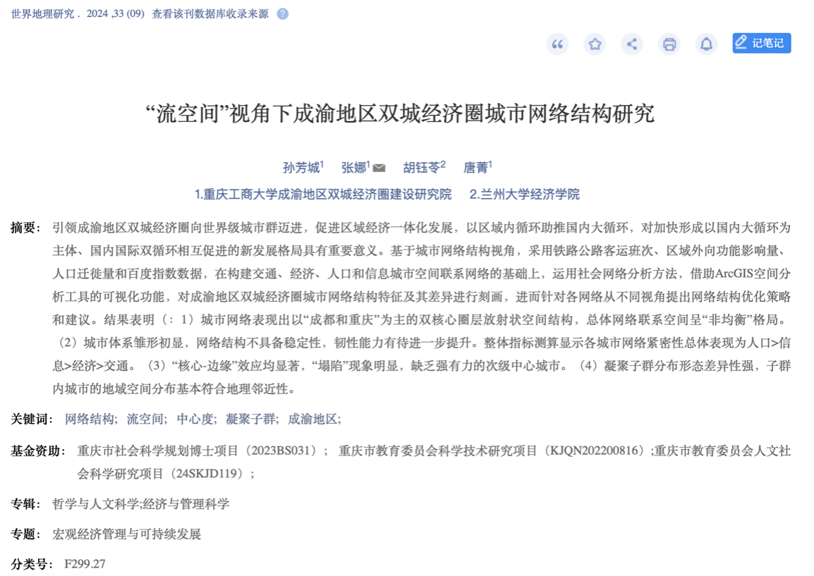 2024年9月,yl23411永利(集团)有限公司官网孙芳城教授、博士研究生张娜等在重要学术期刊《世界地理研究》发表学术论文《“流空间”视角下成渝地区双城经济圈城市网络结构研究》。