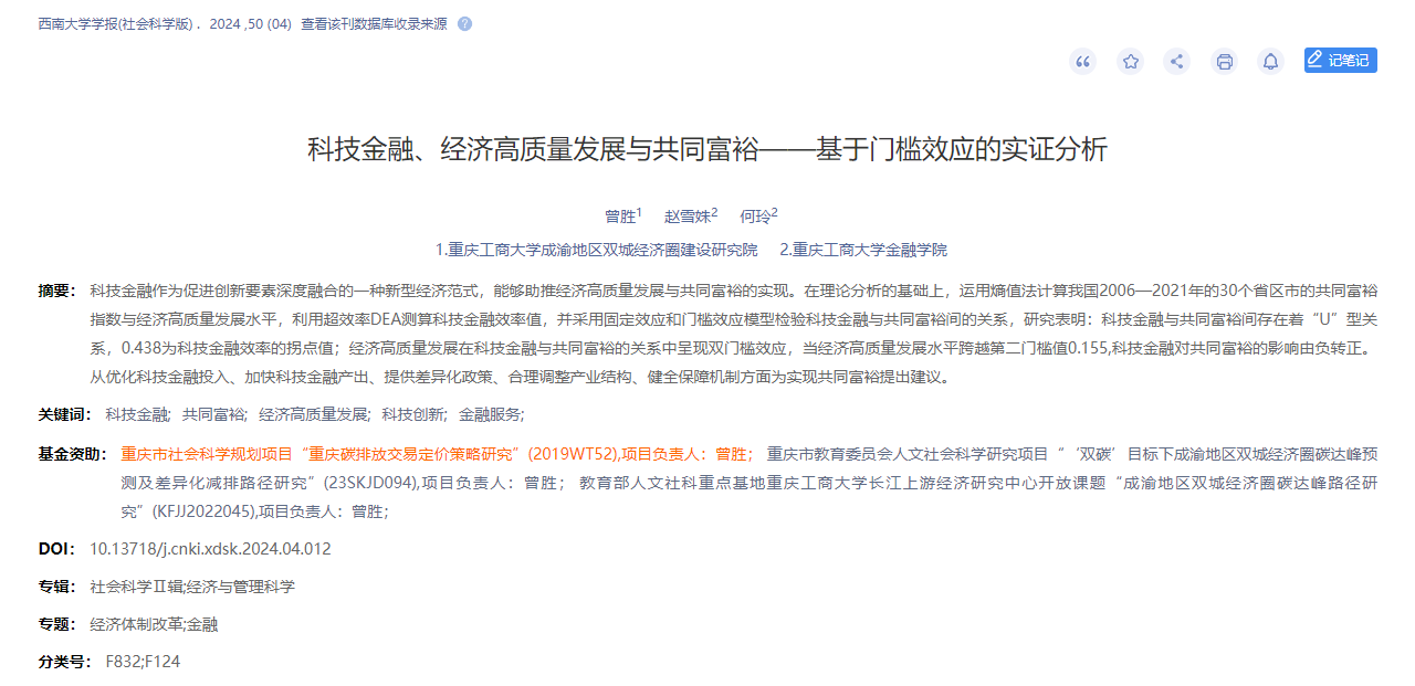 2024年7月,成渝地区双城经济圈建设yl23411永利(集团)有限公司官网曾胜教授等在重要学术期刊《西南大学学报(社会科学版)》发表论文《科技金融、经济高质量发展与共同富裕——基于门槛效应的实证分析》。