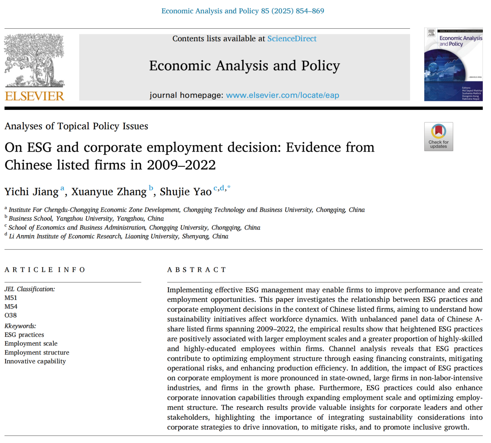 近日,成渝地区双城经济圈建设yl23411永利(集团)有限公司官网专职研究员蒋艺翅博士的文章“On ESG and corporate employment decision: Evidence from Chinese listed firms in 2009-2022”,在《Economic Analysis and Policy》上发表,该期刊系SSCI中科院2区、JCR 1区期刊。