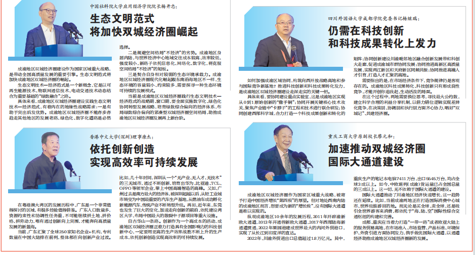 10月24日,由中共重庆市委宣传部、中共四川省委宣传部指导,重庆市社会科学界联合会、四川省社会科学界联合会主办,重庆两江新区管理委员会、四川天府新区管理委员会、重庆工商大学、西南财经大学、成都市社会科学界联合会、教育部人文社会科学重点研究基地长江上游经济研究中心等单位联合承办的第二届成渝地区双城经济圈发展论坛在悦来国际会展中心顺利举行。来自全国各地高校、智库、社科界和政府部门的近300位专家学者,围绕壮大成渝主轴、加快建设现代化产业体系、持续提升区域协同创新能力、培育川渝发展新动能等问题开展研讨,建言献策,分享他们的精彩观点。