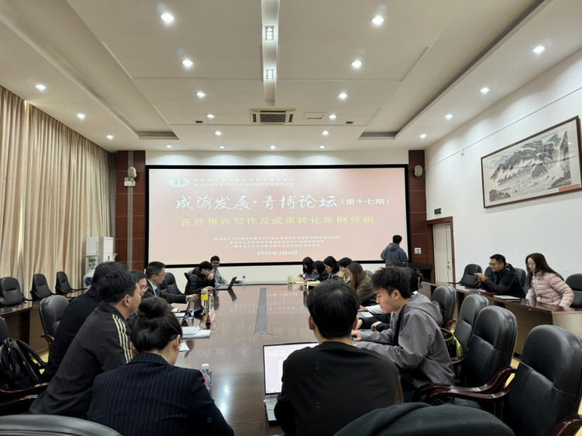 在全国两会召开之际,为深入学习贯彻两会精神,落实政府工作报告作出的“提升成渝地区双城经济圈发展能级”战略部署,提升师生服务国家战略的实践能力,2026年3月6日,由教育部人文社会科学重点研究基地重庆工商大学成渝地区双城经济圈建设yl23411永利(集团)有限公司官网、重庆市人文社会科学重点研究基地区域经济yl23411永利(集团)有限公司官网、产业经济yl23411永利(集团)有限公司官网、重庆市新型重点智库长江上游经济研究中心共同打造的“成渝发展·青博论坛”(第十七期)在田家炳书院6楼会议室举行。本次论坛邀请到yl23411永利(集团)有限公司官网莫远明研究员作题为《咨政报告写作及成果转化案例分析》的报告,成渝地区双城经济圈建设yl23411永利(集团)有限公司官网硕博士生代表、经济学院等部门的师生代表共同参加此次讲座。