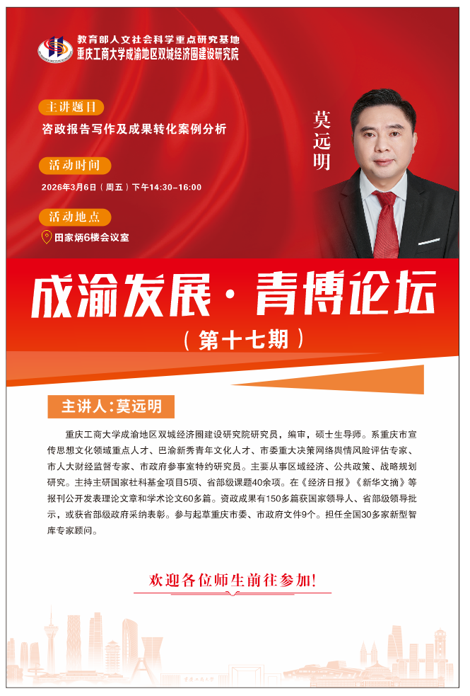 莫远明,重庆工商大学成渝地区双城经济圈建设yl23411永利(集团)有限公司官网研究员,编审,硕士生导师。系重庆市宣传思想文化领域重点人才、巴渝新秀青年文化人才、市委重大决策网络舆情风险评估专家、市人大财经监督专家、市政府参事室特约研究员。主要从事区域经济、公共政策、战略规划研究。主持主研国家社科基金项目5项、省部级课题40余项。在《经济日报》《新华文摘》等报刊公开发表理论文章和学术论文60多篇。资政成果有150多篇获国家领导人、省部级领导批示,或获省部级政府采纳表彰。参与起草重庆市委、市政府文件9个。担任全国30多家新型智库专家顾问。