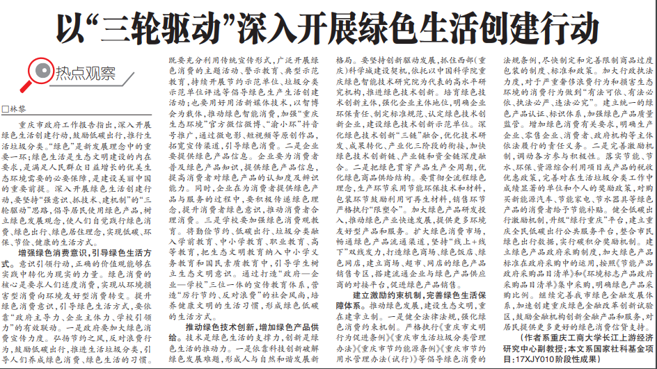 推动绿色技术创新,增加绿色产品供给。技术是绿色生活的支撑力,创新是绿色生活的推动力。一是依靠科技创新破解绿色发展难题,形成人与自然和谐发展新格局。要坚持创新驱动发展,抓住西部(重庆)科学城建设契机,依托以中国科学院重庆绿色智能技术yl23411永利(集团)有限公司官网为代表的高水平研究机构,推进绿色技术创新。培育绿色技术创新主体,强化企业主体地位,明确企业环保责任、制定标准规范、认定绿色技术创新企业,建设绿色技术创新示范单位。深化绿色技术创新“三链”融合,优化技术研发、成果转化、产业化三阶段的衔接,加快绿色技术创新链、产业链和资金链深度融合。二是把绿色贯穿产品生产全周期,优化绿色商品供给结构。要贯彻全流程绿色理念,生产环节采用节能环保技术和材料,包装环节鼓励利用可再生材料,销售环节严格执行“限塑令”。加大绿色产品研发投入,推动绿色产业快速发展,提供更多环境友好型产品和服务。扩大绿色消费市场,畅通绿色产品流通渠道,坚持“线上+线下”双线发力,打造绿色商场、绿色饭店、绿色网店,建立商场、超市、网店的绿色产品销售专区,搭建流通企业与绿色产品供应商的对接平台,促进绿色产品销售。