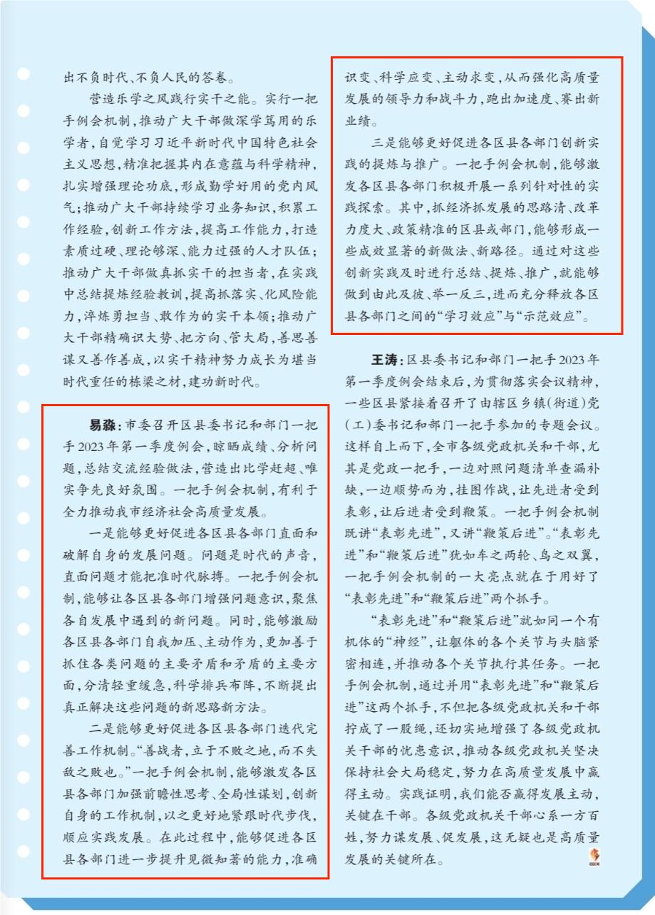 易淼:市委召开区县委书记和部门一把手2023年第一季度例会,晾晒成绩、分析问题,总结交流经验做法,营造出比学赶超、唯实争先良好氛围。一把手例会机制,有利于全力推动我市经济社会高质量发展。