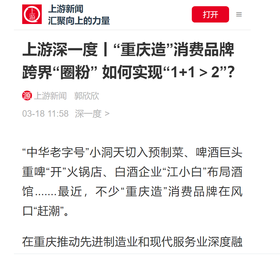 “中华老字号”小洞天切入预制菜、啤酒巨头重啤“开”火锅店、白酒企业“江小白”布局酒馆.......最近,不少“重庆造”消费品牌在风口“赶潮”。