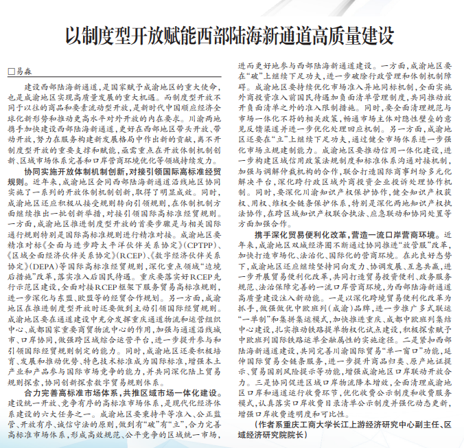 建设西部陆海新通道,是国家赋予成渝地区的重大使命,也是成渝地区实现高质量发展的重大机遇。而制度型开放不同于以往的商品和要素流动型开放,是新时代中国顺应经济全球化新形势和推动更高水平对外开放的内在要求。川渝两地携手加快建设西部陆海新通道,更好在西部地区带头开放、带动开放,努力在服务构建新发展格局中作出新的贡献,离不开制度型开放的重要支撑和赋能,亟需重点在开放体制机制创新、区域市场体系完善和口岸营商环境优化等领域持续发力。