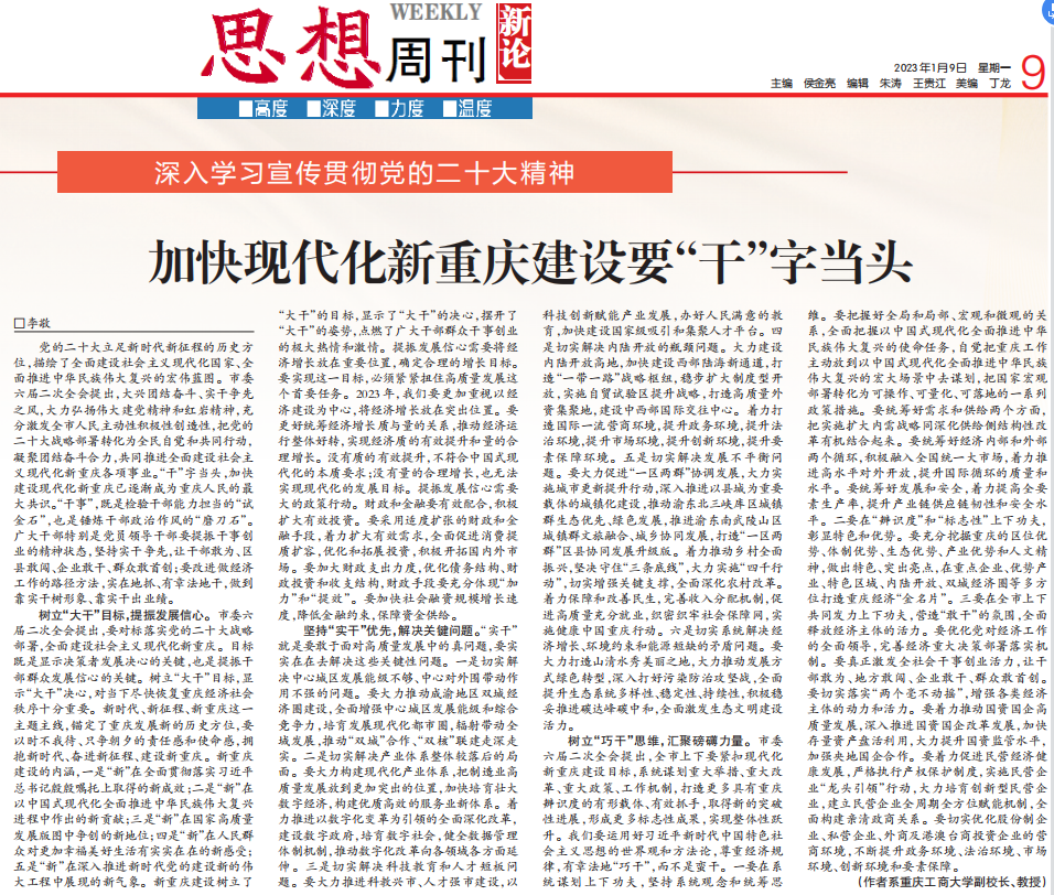 树立“大干”目标,提振发展信心。市委六届二次全会提出,要对标落实党的二十大战略部署,全面建设社会主义现代化新重庆。目标既是显示决策者发展决心的关键,也是提振干部群众发展信心的关键。树立“大干”目标,显示“大干”决心,对当下尽快恢复重庆经济社会秩序十分重要。新时代、新征程、新重庆这一主题主线,锚定了重庆发展新的历史方位,要以时不我待、只争朝夕的责任感和使命感,拥抱新时代、奋进新征程、建设新重庆。新重庆建设的内涵,一是“新”在全面贯彻落实习近平总书记殷殷嘱托上取得的新成效;二是“新”在以中国式现代化全面推进中华民族伟大复兴进程中作出的新贡献;三是“新”在国家高质量发展版图中争创的新地位;四是“新”在人民群众对更加幸福美好生活有实实在在的新感受;五是“新”在深入推进新时代党的建设新的伟大工程中展现的新气象。新重庆建设树立了“大干”的目标,显示了“大干”的决心,摆开了“大干”的姿势,点燃了广大干部群众干事创业的极大热情和激情。提振发展信心需要将经济增长放在重要位置,确定合理的增长目标。要实现这一目标,必须紧紧扭住高质量发展这个首要任务。2023年,我们要更加重视以经济建设为中心,将经济增长放在突出位置。要更好统筹经济增长质与量的关系,推动经济运行整体好转,实现经济质的有效提升和量的合理增长。没有质的有效提升,不符合中国式现代化的本质要求;没有量的合理增长,也无法实现现代化的发展目标。提振发展信心需要大的政策行动。财政和金融要有效配合,积极扩大有效投资。要采用适度扩张的财政和金融手段,着力扩大有效需求,全面促进消费提质扩容,优化和拓展投资,积极开拓国内外市场。要加大财政支出力度,优化债务结构、财政投资和收支结构,财政手段要充分体现“加力”和“提效”。要加快社会融资规模增长速度,降低金融约束,保障资金供给。