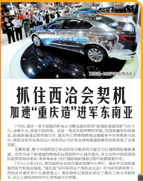 7月21日至24日,第四届西洽会将在重庆国博中心举行。重庆作为国家重要的现代制造业基地,“重庆造”如何利用这个契机走出去?在当前经济形势下,西洽会对重庆有什么重要意义?重庆晨报记者就此采访了重庆工商大学副校长、长江上游经济研究中心常务副主任李敬。